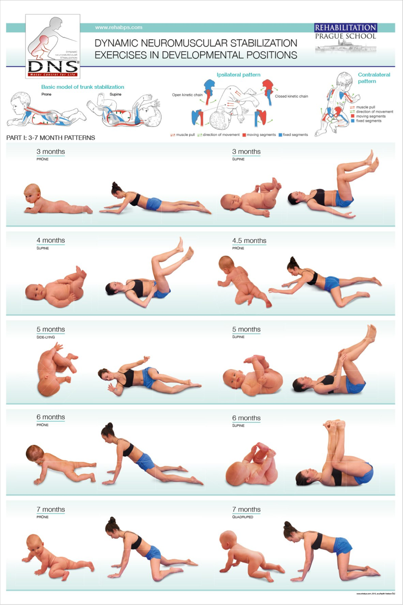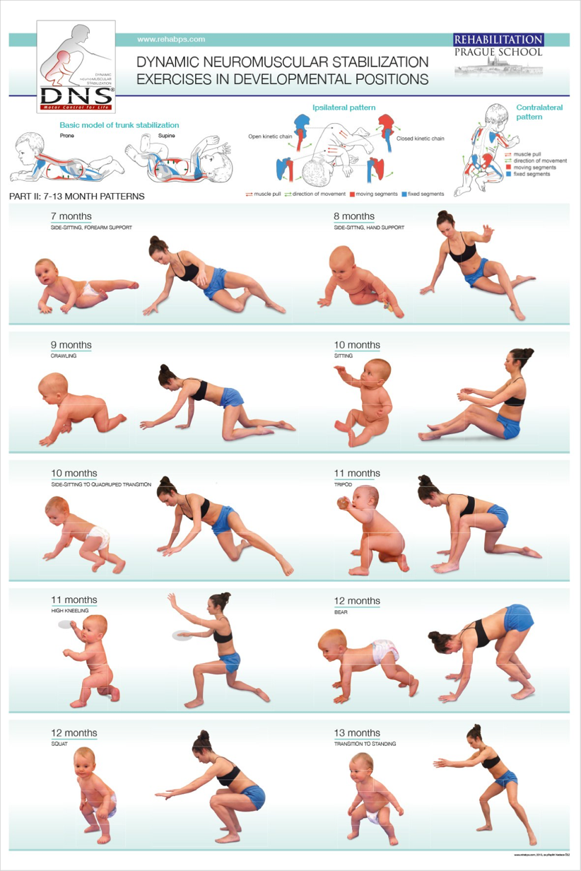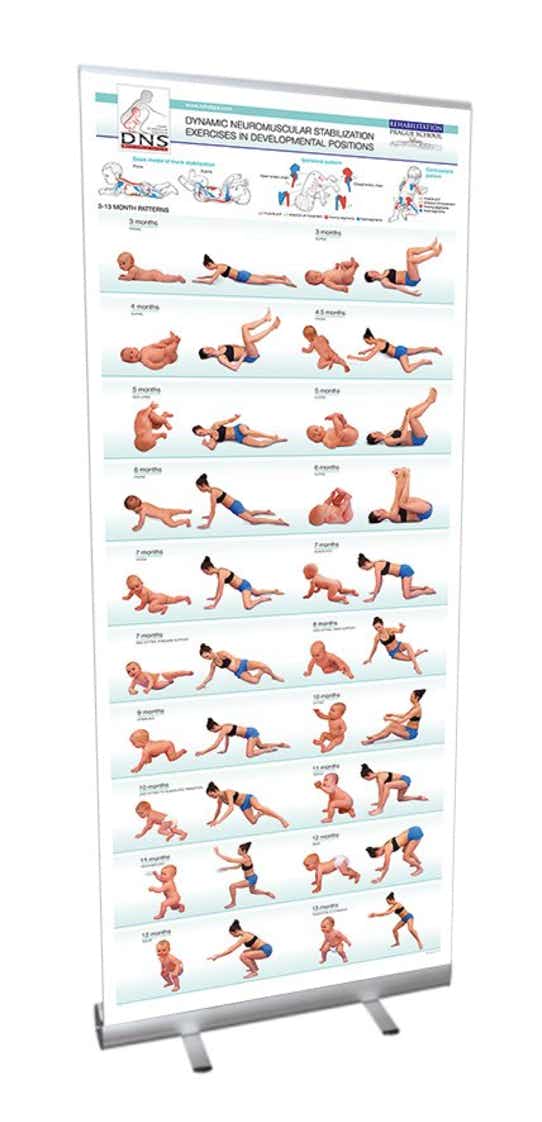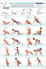 Developmental positions starting at 3 months through13 months are demonstrated in both, an infant and an adult. Posters also demonstrate basic principles of core stabilization, ipsilateral and contralateral locomotion patterns and open and closed kinetic chains.