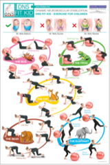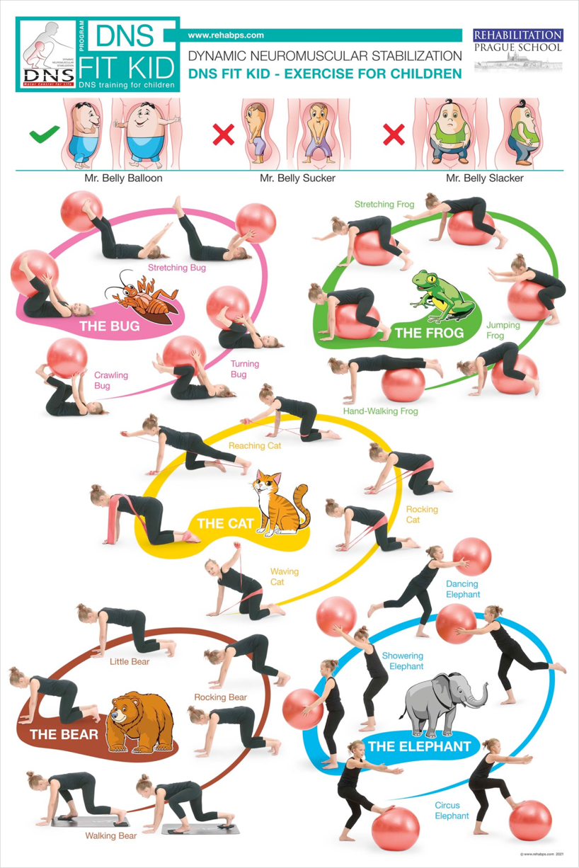 DNS FIT KID poster depicts exercise modifications for children in DNS animal positions. This poster is a valuable tool to supplement the DNS FIT KID Journal and a quick guide on how to train correct trunk stabilization, functional joint centration and dynamic movement patterns with children in a playful way. Variations include a ball, bands and a sliding mat, which increase playfulness and create a fun exercise environment. The dynamic exercises, shown around the basic animal picture in the middle, help to reinforce correct trunk stability during movement. The icons of Mr.Belly Balloon, Mr. Belly Sucker and Mr. Slacker help children and their parents to understand how correct and incorrect trunk stabilization stereotypes manifest on the shape of the belly.
