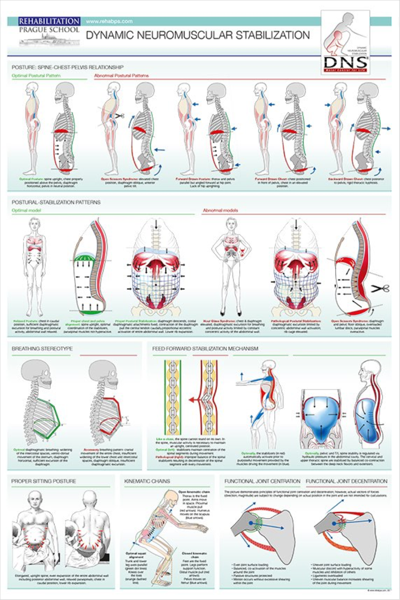 Use this poster to both introduce the original concept of "Functional Joint Centration" versus "Decentration", while clarifying stabilization strategies to your clients. Save time demonstrating the most common imbalances in human erect posture, optimal and faulty coordination among muscles stabilizing the chest, spine and pelvis. The new poster quickly demonstrates how ideal and faulty breathing stereotypes differ, while also showing proper sitting and squatting postures.