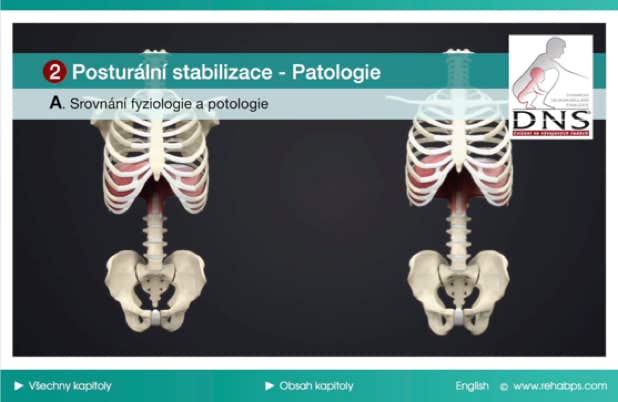 Na originálních DNS animacích jsou znázorněny modely ideálního vzoru posturální stabilizace, funkční kloubní centrace a nejčastějších poruch, se kterými se v klinické i sportovní praxi setkáváme. Snadno pochopitelným způsobem je znázorněna fyziologická i patologická dechově-posturální funkce bránice v souhře s ostatními svaly integrovaného stabilizačního systému. Všechny animace jsou podrobně a srozumitelně komentovány v českém jazyce. Soubor animací v délce 43 min napomůže studentům DNS kurzů snadno pochopit optimální a narušený vzor držení těla a poslouží také jako vhodná pomůcka pro vysvětlení problematiky pacientům a sportovním klientům.